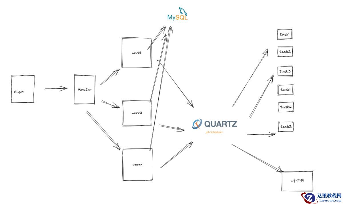 我们主要从主节点,从节点,数据表这几个方面来简单分析,整个业务的时序流程,从本质来看并不复杂master和Work之间的关系是相互配合的,可能乍一看下面整个图有点混乱,下面来解释一下,其实Master节点将任务添加到数据中,然后work节点,去从对应的数据表中取出任务数据,然后根据任务对应的配置,生成配置信息,调用Quartz执行任务,这就是我们整个框架中最核心的业务。