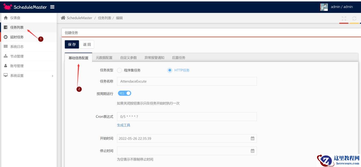 6.使用任务列表菜单,创建定时调度任务,配置基础信息和元数据配置,然后点击保存就开始执行任务