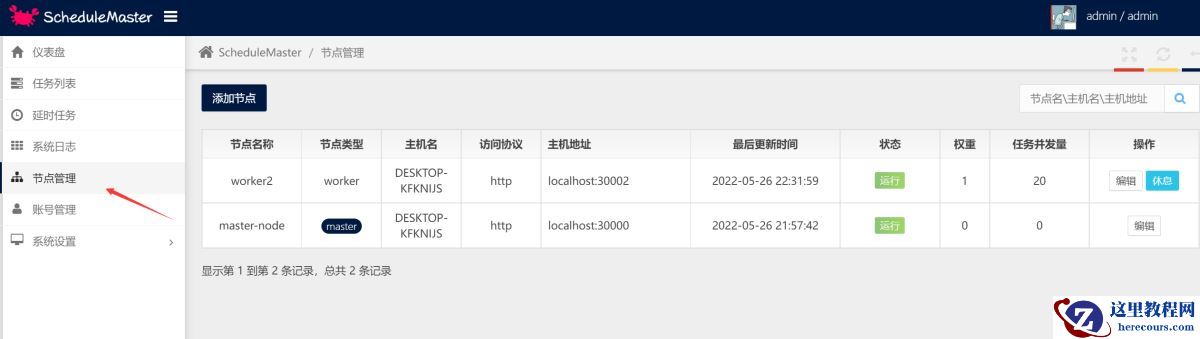 5.准备就绪后,使用后台查看节点管理,可以看到web主节点30000和任务调度的接口30002已经在运行