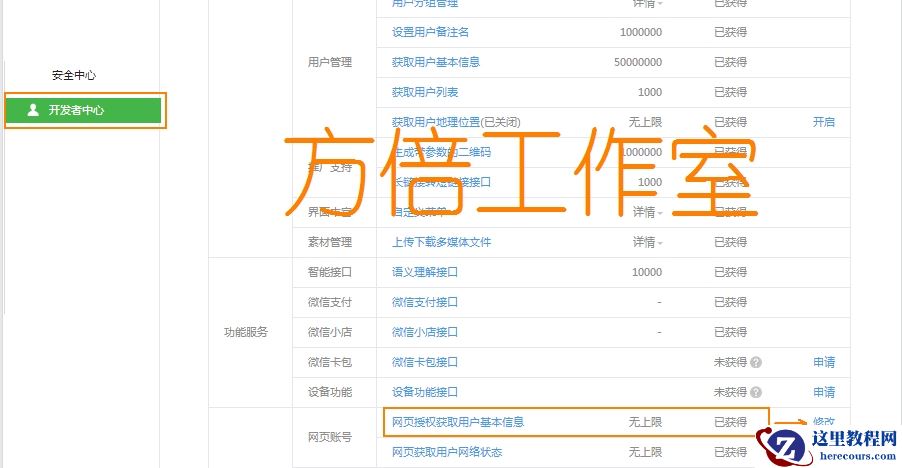 进入微信公众平台后台后,依次进入开发者中心-权限表,找到网页授权获取用户基本信息,