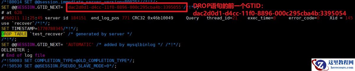 # 1. 查看全备对应的Binlog起点(获取文件名与位点) cat /data/backup/recover/xtrabackup_binlog_info # 输出示例:mysql-bin.000026 196 dac2d0d1-d4cc-11f0-8896-000c295cba4b:1-3395053 # 2. 传输源实例Binlog文件到恢复实例 scp 192.168.184.151:/data/mysql/binlog/mysql-bin.000026/data/backup/binlog # 3. 定位drop操作前的有效事务 cd /data/backup/binlog mysqlbinlog mysql-bin.000026 --start-datetime='2026-02-11 10:20:00' --stop-datetime='2026-02-11 14:40:00' --base64-output=decode-rows -v > 1.sql cat 1.sql | grep -A 5 -B 5 "DROP TABLE" # 找到GTID范围:dac2d0d1-d4cc-11f0-8896-000c295cba4b:3395054 # 4. 创建恢复专用用户 mysql -uroot -p CREATE USER `u_recover`@`localhost` IDENTIFIED WITH MYSQL_NATIVE_PASSWORD BY 'Ujg8G_aUU'; GRANT insert,SESSION_VARIABLES_ADMIN,REPLICATION_APPLIER ON *.* TO `u_recover`@`localhost`;" # 5. 回放Binlog增量数据 mysqlbinlog --include-gtids='dac2d0d1-d4cc-11f0-8896-000c295cba4b:3395035-3395054' mysql-bin.000026 | mysql -uu_recover -p'Ujg8G_aUU' # 6. 验证增量恢复(此时应有3条完整数据) mysql -uroot -p -e "select * from recover.test_recover;"