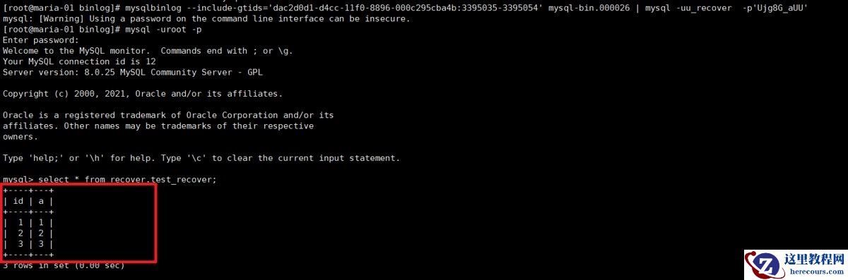 # 1. 恢复实例导出完整表 mysqldump -uroot -p --set-gtid-purged=off --skip-add-drop-table recover test_recover > recover_test_recover.sql # 2. 传输到源实例 scp recover_test_recover.sql 192.168.184.151:/data/backup # 3. 源实例导入数据 mysql -uroot -p recover data/backup/recover_test_recover.sql # 4. 最终验证 mysql -uroot -p -e "select * from recover.test_recover;"