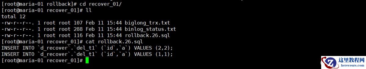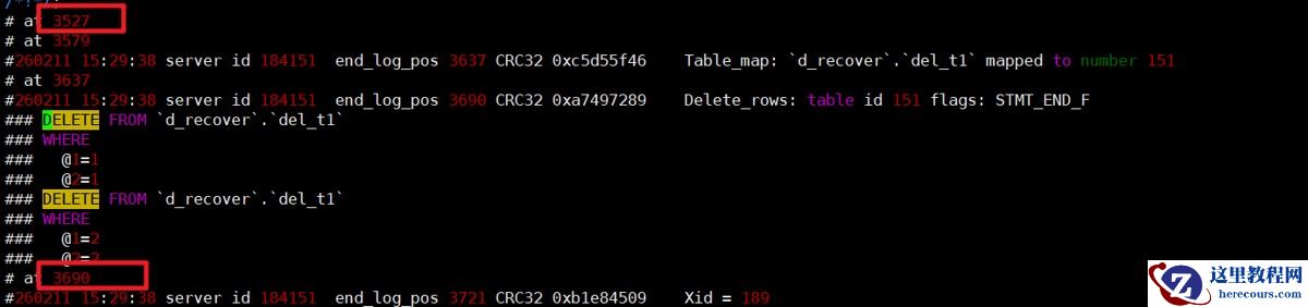 # 2. 复制目标Binlog文件 mkdir /data/backup/rollback cp /data/mysql/binlog/mysql-bin.000026 /data/backup/rollback # 3. 定位delete操作位点 cd /data/backup/rollback mysqlbinlog mysql-bin.000026 --start-datetime='2026-02-11 15:25:00' --stop-datetime='2026-02-11 15:32:00' --base64-output=decode-rows -v > operation.sql cat operation.sql | grep -A 10 -B 10 "delete from d_recover.del_t1" # 记录start-pos(3511)与stop-pos(3674)