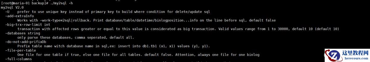 cd /data/backup wget https://github.com/liuhr/my2sql/blob/master/releases/centOS_release_7.x/my2sql chmod +x my2sql ./my2sql -h # 验证安装