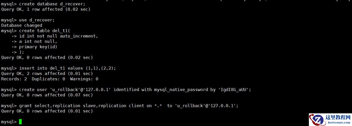-- 1. 创建测试库表与数据 create database d_recover; use d_recover; CREATE TABLE del_t1 ( id int NOT NULL AUTO_INCREMENT, a int NOT NULL, PRIMARY KEY (id) ) ENGINE=InnoDB CHARSET=utf8mb4; insert into del_t1 values (1,1),(2,2); -- 2. 创建解析专用用户 CREATE USER `u_rollback`@`127.0.0.1` IDENTIFIED WITH MYSQL_NATIVE_PASSWORD BY 'IgdI8G_aUU'; GRANT SELECT, REPLICATION SLAVE,REPLICATION CLIENT ON *.* TO `u_rollback`@`127.0.0.1`;