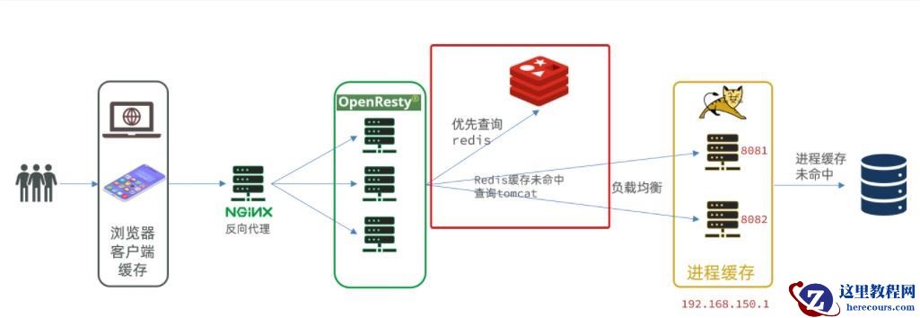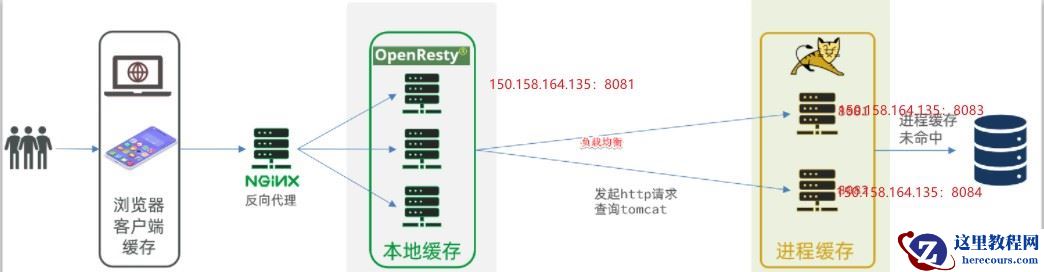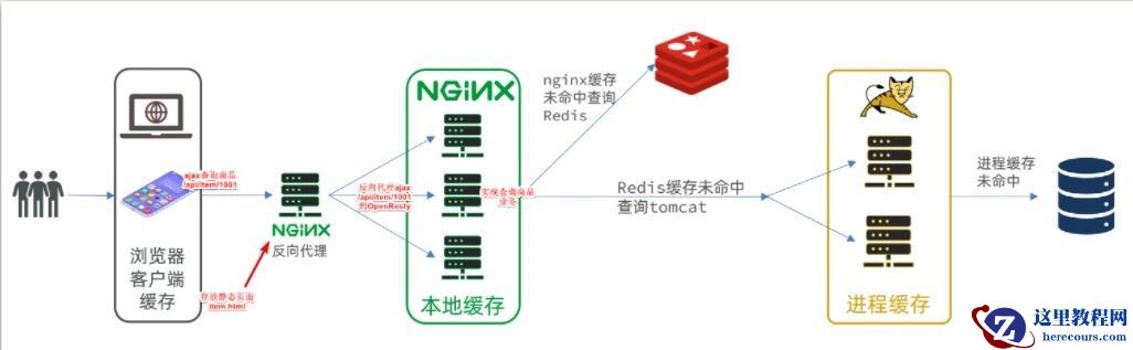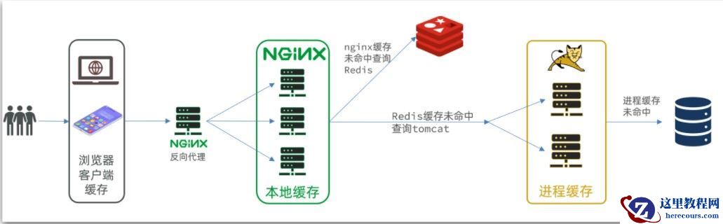 浏览器访问静态资源时,优先读取浏览器本地缓存访问非静态资源(ajax查询数据)时,访问服务端请求到达Nginx后,优先读取Nginx本地缓存如果Nginx本地缓存未命中,则去直接查询Redis(不经过Tomcat)如果Redis查询未命中,则查询Tomcat请求进入Tomcat后,优先查询JVM进程缓存如果JVM进程缓存未命中,则查询数据库