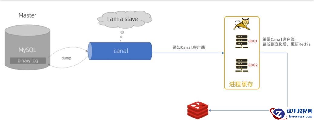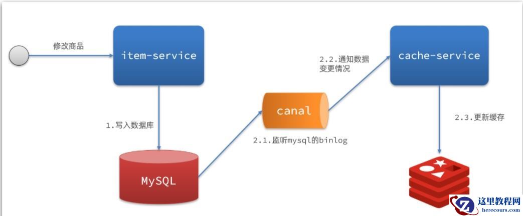 商品服务完成商品修改后,业务直接结束,没有任何代码侵入Canal监听MySQL变化,当发现变化后,立即通知缓存服务缓存服务接收到canal通知,更新缓存代码零侵入