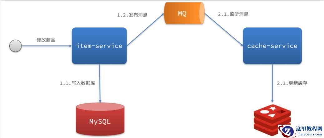 商品服务完成对数据的修改后,只需要发送一条消息到MQ中。缓存服务监听MQ消息,然后完成对缓存的更新依然有少量的代码侵入。