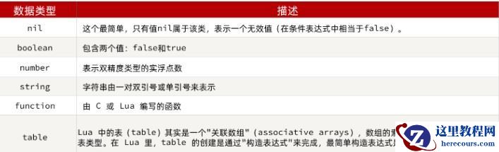 Lua中支持的常见数据类型包括: