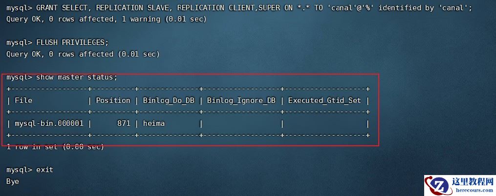 docker exec -it 7b4823d74e97 /bin/bash mysql -uroot -p123 create user canal@'%' IDENTIFIED by 'canal'; GRANT SELECT, REPLICATION SLAVE, REPLICATION CLIENT,SUPER ON *.* TO 'canal'@'%' identified by 'canal'; FLUSH PRIVILEGES; show master status;