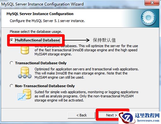 “Non-Transactional Database Only(非事务处理型,较简单,主要做一些监控、记数用,对MyISAM数据类型的支持仅限于non-transactional),随自己的用途而选择了,我这里选择“Multifunctional Database ”,按“Next”继续