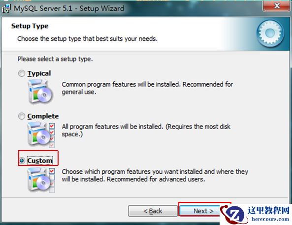 选择安装类型,有“Typical(默认)”、“Complete(完全)”、“Custom(用户自定义)”三个选项,我们选择“Custom”,有更多的选项,也方便熟悉安装过程。