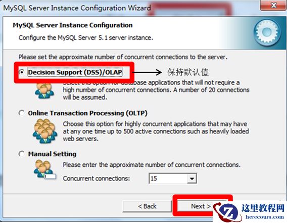 “Manual Setting(手动设置,自己输一个数)”,我这里选“Decision Support(DSS)/OLAP”,自己的服务器,应该够用了,按“Next”继续。