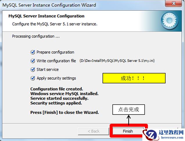 设置完毕,按“Finish”结束mysql的安装与配置——这里有一个比较常见的错误,就是不能“Start service”,一般出现在以前有安装mysql 的服务器上,解决的办法,先保证
