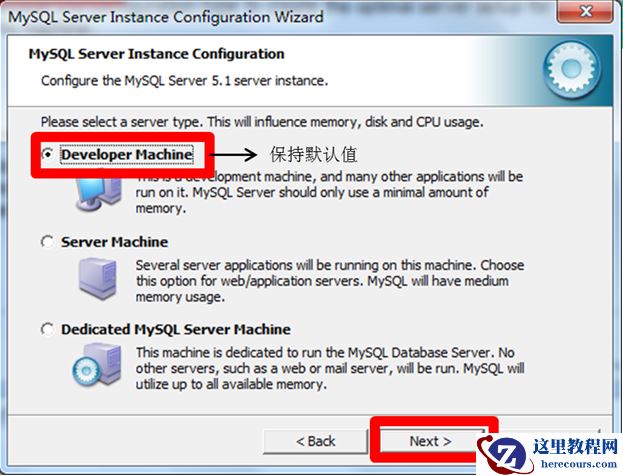 选择服务器类型,“Developer Machine(开发测试类,mysql 占用很少资源)”、“Server Machine(服务器类型,mysql占用较多资源)”、“Dedicated MySQL Server Machine