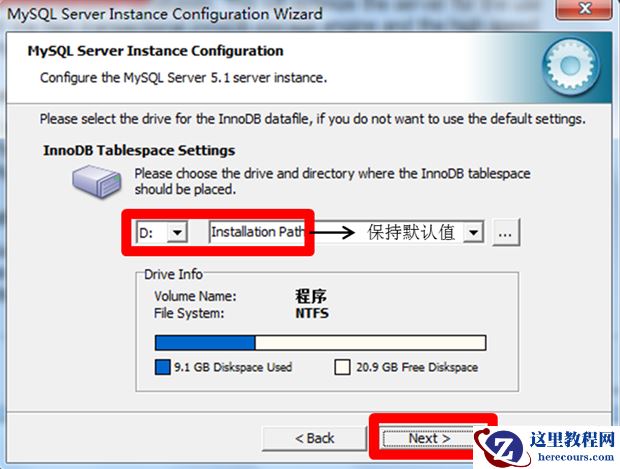对InnoDB Tablespace进行配置,就是为InnoDB 数据库文件选择一个存储空间,如果修改了,要记住位置,重装的时候要选择一样的地方,否则可能会造成数据库损坏,当然,对数据库做个备份就没问题了,这里不详述。我这里没有修改,使用默认位置,直接按“Next”继续。