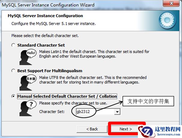 NAMES GBK;”(运行一次就行了,GBK可以替换为其它值,视这里的设置而定),就可以正常的使用汉字(或其它文字)了,否则不能正常显示汉字。我这里选的“gb2312”,按“Next”继续。