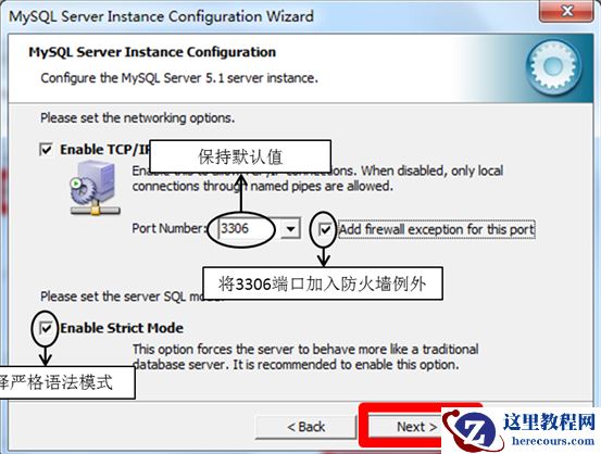 是否启用TCP/IP连接,设定端口,如果不启用,就只能在自己的机器上访问mysql 数据库了,我这里启用,把前面的勾打上,Port Number:3306,在这个页面上,您还可以选择“启用标准模式”(Enable Strict Mode),这样MySQL就不会允许细小的语法错误。如果您还是个新手,我建议您取消标准模式以减少麻烦。但熟悉MySQL以后,尽量使用标准模式,因为它可以降低有害数据进入数据库的可能性。还有一个关于防火墙的设置“Add firewall exception ……”需要选中,将MYSQL服务的监听端口加为windows防火墙例外,避免防火墙阻断。按“Next”继续。