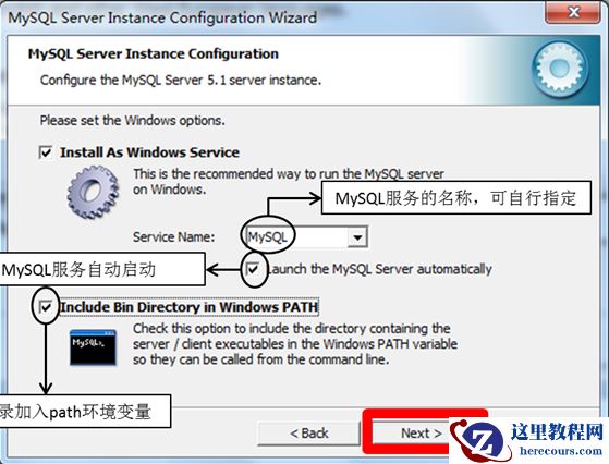 选择是否将mysql 安装为windows服务,还可以指定Service Name(服务标识名称),是否将mysql的bin目录加入到Windows PATH(加入后,就可以直接使用bin下的文件,而不用指出目录名,比如连接,“mysql.exe -uusername -ppassword;”就可以了,不用指出mysql.exe的完整地址,很方便),我这里全部打上了勾,Service Name不变。按“Next”继续。