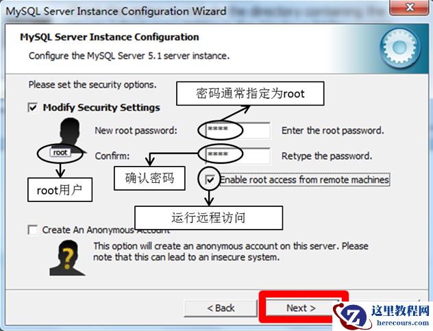 An Anonymous Account(新建一个匿名用户,匿名用户可以连接数据库,不能操作数据,包括查询)”,一般就不用勾了,设置完毕,按“Next”继续。