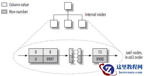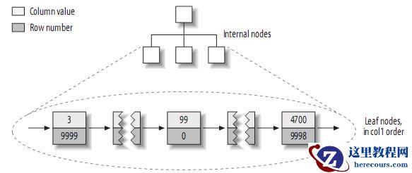 注:MyISAM不支持聚簇索引,索引中每一个叶子节点仅仅包含行号(row number),且叶子节点按照col1的顺序存储。
