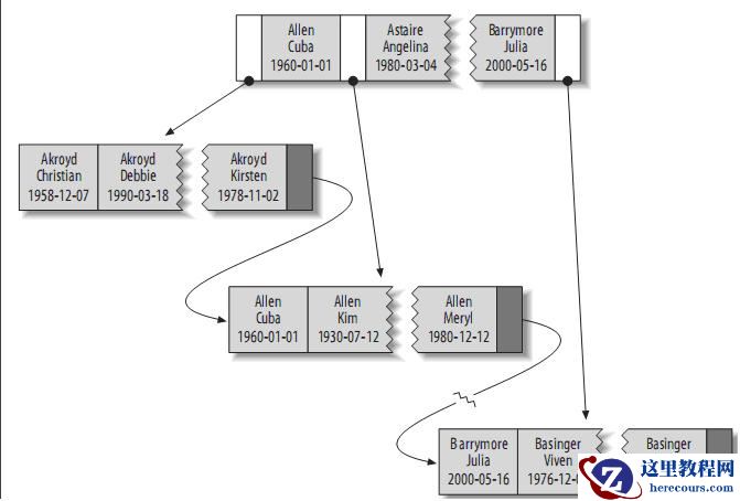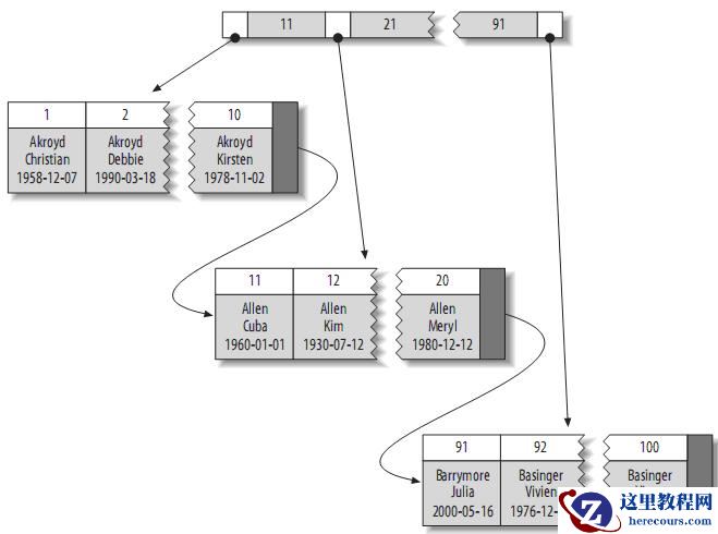(4)匹配值的范围查询(Match a range of values):可以利用索引查找last name在Allen和Barrymore之间的人,仅仅使用索引中第1列。