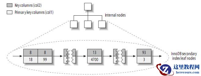 注:聚簇索引中的每个叶子节点包含primary key的值,事务ID和回滚指针(rollback pointer)——用于事务和MVCC,和余下的列(如col2)。