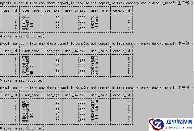 =any的用法和in的效果是一样的;>any是说要大于子查询结果集里的任意一个就可以,简单理解就是只要大于结果集中最小的那个就可以;any是只要大于1就行,而