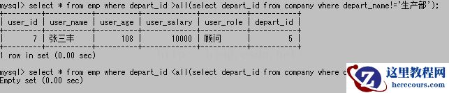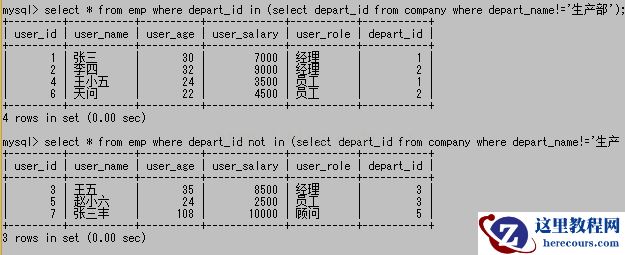 其中in表示包含于后边子查询结果集里的任意一个,not in表示不包含于后边结果集里的任意一个。上图子查询的结果中,返回depart_id为1、2、4,因此第一个查询就会查出emp中所有depart_id是1或2或4的,第二个就会查出既不是1也不是2也不是4的。