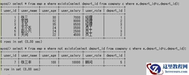 在上便的查询中,查询语句会先从emp中查询一条数据,然后拿这条数据的depart_id和company中的depart_id比较,当存在两个id相同的数据时,就会有结果返回,然后最终返回6条数据,而第二个查询一样的道理,当不存在两个id相同的数据时,主查询才有结果返回,只有一条数据。