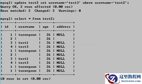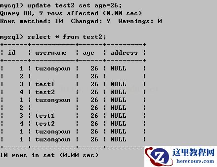 4、修改更新数据:update tablename set 字段名1=值1,字段名2=值2...;后边不加条件则更新所有