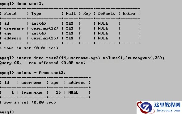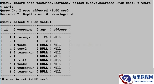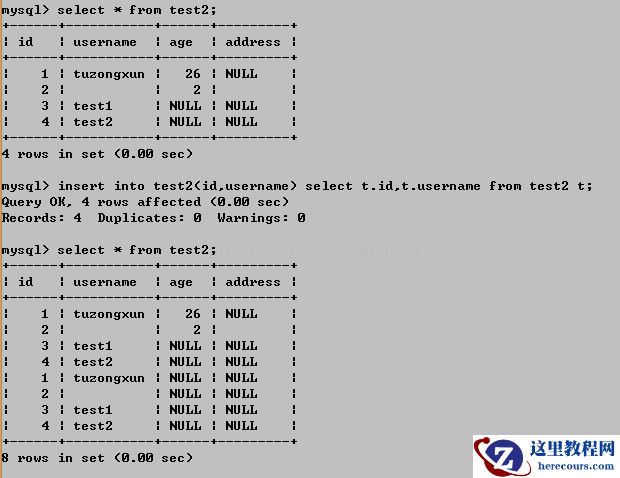 3、插入查询结果:insert into tablename1(字段1,字段2) select (字段1,字段2) from tablename2;