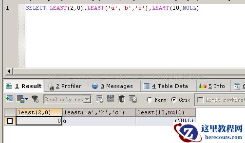 SELECT LEAST(2,0),LEAST('a','b','c'),LEAST(10,NULL)