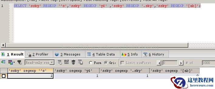 SELECT 'ssky' REGEXP '^s','ssky' REGEXP 'y$' ,'ssky' REGEXP '.sky','ssky' REGEXP '[ab]';