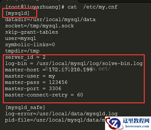 [root@liuyazhuang ~]# vi /etc/my.cnf [mysqld] datadir=/usr/local/mysql/data socket=/tmp/mysql.sock skip-grant-tables user=mysql # Disabling symbolic-links is recommended to prevent assorted security risks symbolic-links=0 tmpdir=/tmp [mysqld_safe] log-error=/usr/local/data/mysqld.log pid-file=/usr/local/mysql/data/mysqld.pid ###############以下是添加主从的配置 server_id = 2 log-bin = /usr/local/mysql/log/solve-bin.log master-host = 172.17.210.199 master-user = test master-pass = 123456 master-port = 3306 master-connect-retry = 60