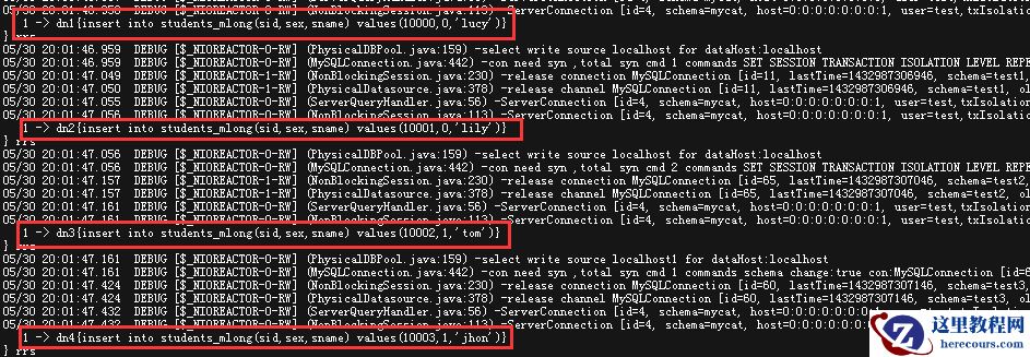 看一下MyCAT的Debug日志,这两条语句被分配到了dn1和dn2上面,数据库里面也插入了相对应的数据