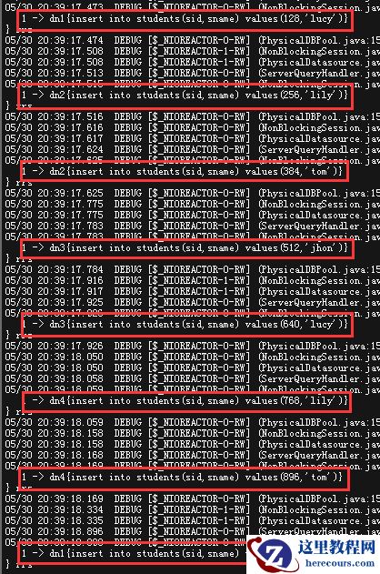 试着以128为偏移值插入了八条数据,直接看MyCAT的日志