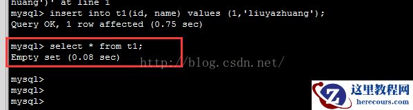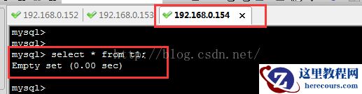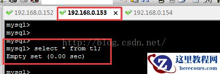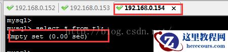 我们先分别查询MySQL数据库表上的相关数据,未通过Amoeba操作数据库的时候,我们是新建的数据库lyz和表t1,此时192.168.0.153和192.168.0.154上MySQL数据表都应该为空,如下图:
