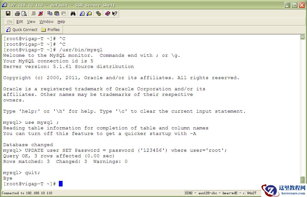 # /usr/bin/mysql Welcome to the MySQL monitor. Commands end with ; or \g. Your MySQL connection id is 3 to server version: 3.23.56 Type ‘help;' or ‘\h' for help. Type ‘\c' to clear the buffer. mysql> USE mysql ; Reading table information for completion of table and column names You can turn off this feature to get a quicker startup with -A Database changed mysql> UPDATE user SET Password = password ( ‘new-password' ) WHERE User = ‘root' ; Query OK, 0 rows affected (0.00 sec) Rows matched: 2 Changed: 0 Warnings: 0 mysql> flush privileges ; Query OK, 0 rows affected (0.01 sec) mysql> quit Bye