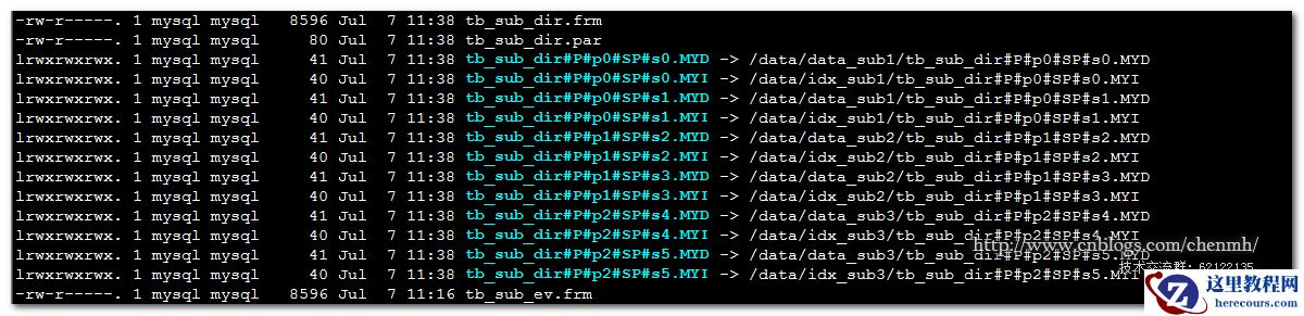指定路径之后在原来的路径中innodb生成了4个指向数据存储的路径文件,myisam生成了一个th.par文件指明该表是分区表,同时数据文件和索引文件指向了实际的存储路径。