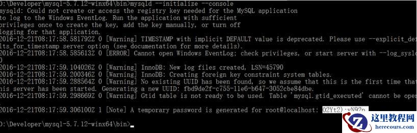 后面有一连串的字母数字符号, 这是 MySQL 生成的随机密码. 要记下来,