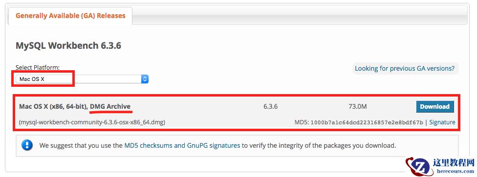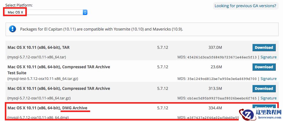 点击进入下载页面,在页面最下方,有下载选项,请确认选择的平台是Mac OS X,然后下载下图用红框划出的安装包。下载时需要登录帐号。
