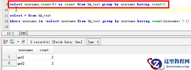 select username,count(*) as count from hk_test group by username having count>1; SELECT username,count(username) as count FROM hk_test GROUP BY username HAVING count(username) >1 ORDER BY count DESC;