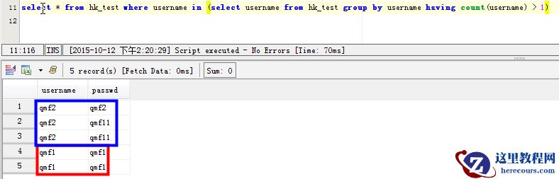 场景三:查看两个字段都重复的记录:比如username和passwd两个字段都有重复的记录: