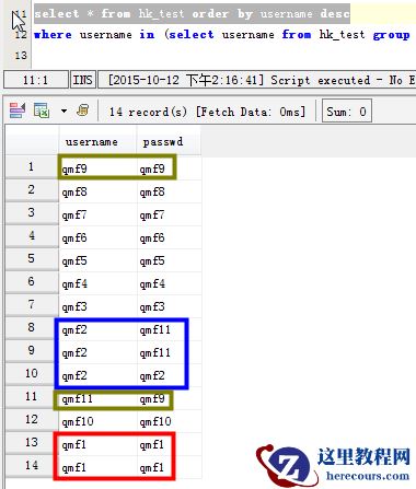 select * from hk_test where username in (select username from hk_test group by username having count(username) > 1) SELECT username,passwd FROM hk_test WHERE username in ( SELECT username FROM hk_test GROUP BY username HAVING count(username)>1) 但是这条语句在mysql中效率太差,感觉mysql并没有为子查询生成临时表。在数据量大的时候,耗时很长时间