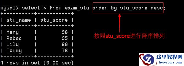 当需要对表中数据按照字段 stu_score 进行降序排列时,在输入语句后加上order by stu_score desc .