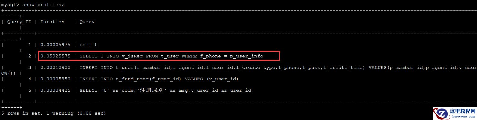 可以看到标红处的sql执行速度与其他sql语句远远不是一个量级的。我们对这行进行优化,比如为字段f_phone建立索引。