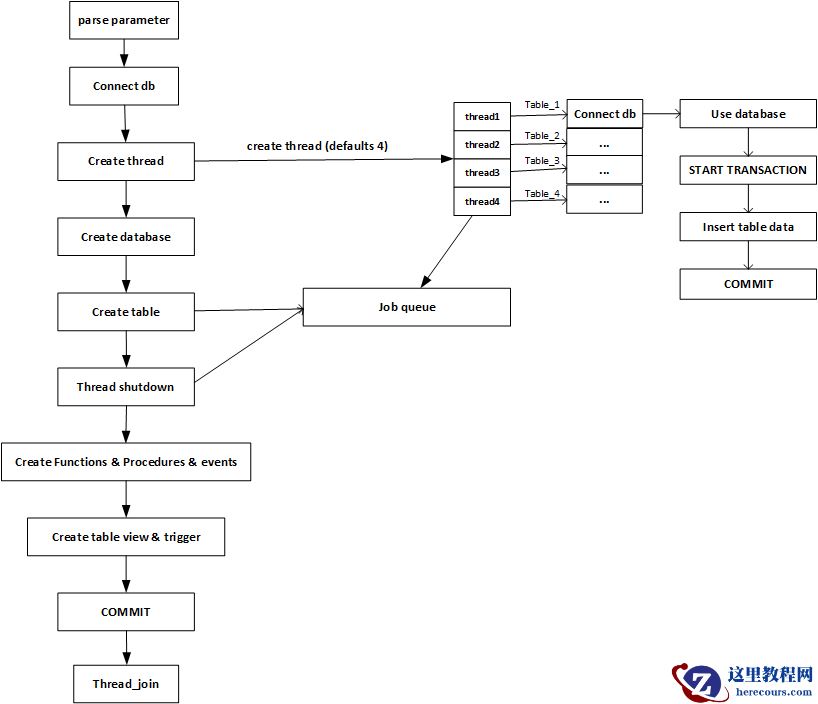 2、接着myloader主线程会生成多个工作线程,由这些工作线程将所有database.table.*.sql文件中的记录导入到对应表中,这个阶段是并行的,并行粒度为文件,工作线程完成所有database.table.*.sql 文件数据导入后销毁;