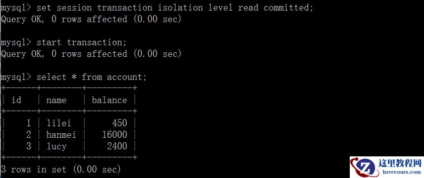 mysql> start transaction; Query OK, 0 rows affected (0.00 sec) mysql> select * from account;+------+--------+---------+| id | name | balance |+------+--------+---------+| 1 | lilei | 300 || 2 | hanmei | 16000 || 3 | lucy | 2400 |+------+--------+---------+3 rows in set (0.00 sec)