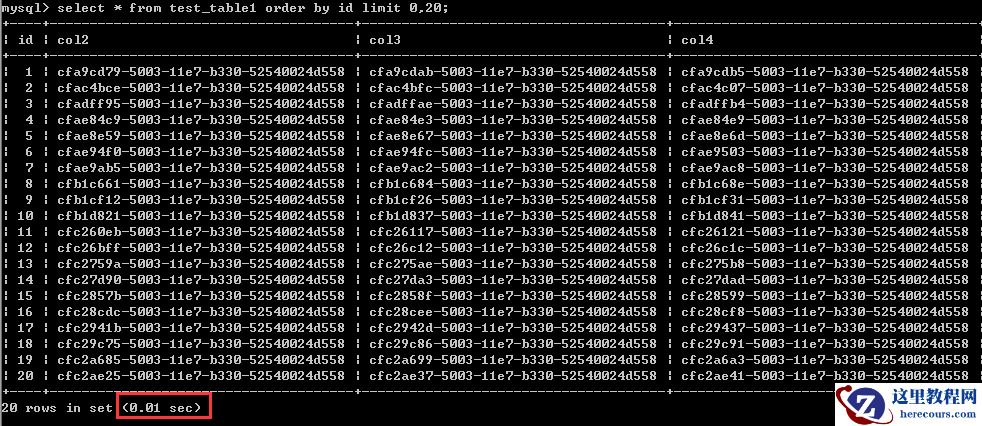 测试一:查询第1-20行的数据,0.01秒